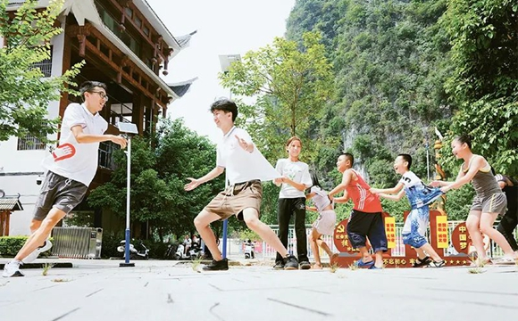图为2023年8月13日,在广西柳州融水苗族自治县易地扶贫搬迁安置点苗家小镇社区,西北大学研究生支教团志愿者开展暑期志愿服务活动,为留守儿童和其他孩子提供家教、游戏和阅读等服务,让孩子们度过快乐充实的暑假。 人民图片 龙涛/摄
