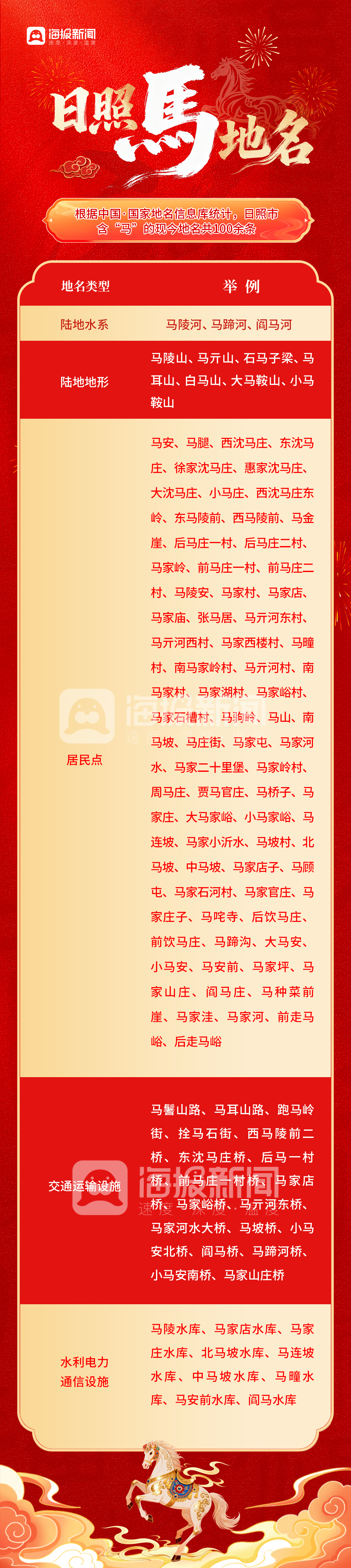 从中国・国家地名信息库的统计数据发现,日照的“马”元素远比想象中深厚。这座山海相拥的城市,现今含“马”字的地名竟有上百个。它们散落于区县之间,藏在村落与山水之中,每一个名字背后都印刻着日照的地理特征与人文记忆。