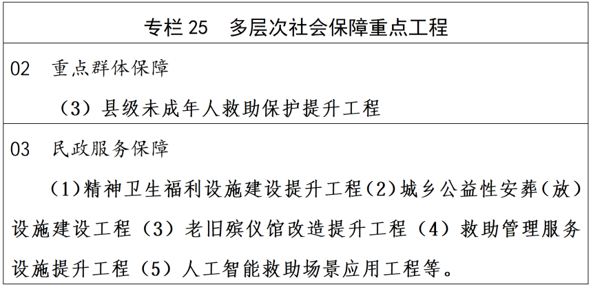 第五十九章 提高居民收入水平 完善收入分配制度体系。更好发挥第三次分配作用,促进和规范公益慈善事业发展。 第六十章 健全多层次社会保障体系 坚持在发展中保障和改善民生,完善覆盖全民、统筹城乡、公平统一、安全规范、可持续的社会保障网。 健全社会救助和社会事务服务体系。制定出台社会救助条例。健全城乡统筹、分层分类的社会救助体系。动态调整社会救助标准,健全最低生活保障、特困人员救助供养、临时救助等救助制度,加强低保边缘家庭、刚性支出困难家庭救助。完善省社会救助动态监测信息平台功能,及时将符合条件的生活困难群众按规定纳入救助范围。发展服务类社会救助,为有需要的社会救助对象提供访视、照料等服务。健全基本殡葬服务制度,加强殡葬领域综合监管,建设一批公益性节地生态安葬设施,因地制宜推广骨灰格位葬、树葬、海葬和深埋不留坟头等绿色安葬方式。 第六十二章 加大重点群体关爱力度 健全关爱服务体系,营造有效保障妇女、未成年人、残疾人等发展权益的社会环境,共享社会发展成果。 强化未成年人关爱保护。坚持儿童优先发展,切实保障儿童生存权、发展权、受保护权和参与权。实施“齐心鲁力护未行动”,探索建立未成年人综合服务平台。完善未成年人救助保护机构、儿童福利机构功能,推动流动留守困境儿童分类帮扶,实施残疾儿童康复救助,深化希望工程、引航计划、齐鲁润春蕾、爱心妈妈、护佑成长等关爱服务。 依法保障残疾人权益。完善残疾人社会保障制度和关爱服务体系,促进残疾人平等充分参与社会生活。完善困难残疾人生活补贴和重度残疾人护理补贴制度,加强重度残疾人托养照护服务。健全残疾人康复医疗、康复训练、辅助器具适配等多元化服务体系,开展精神障碍社区康复服务,加强精神卫生福利机构保障能力。